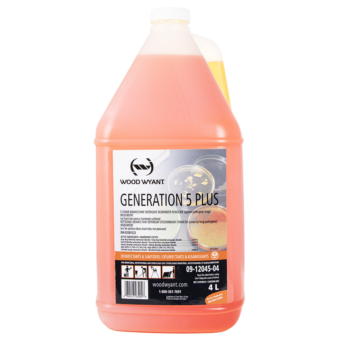GENERATION 5 PLUS Cleaner, Disinfectant, Deodorizer, Fungicide GENERATION 5 PLUS is a phosphate-free formulation designed to provide effective cleaning, deodorizing, and disinfection in hospitals, nursing homes, hotels, schools, food processing establishments, restaurants, athletic/recreation facilities, sports stadiums, amphitheaters, convention centers and other institutions where housekeeping is of prime importance in controlling cross-contamination from treated surfaces. This product, when used as directed, is formulated to disinfect hard non-porous inanimate surfaces such as floors, walls, metal surfaces, stainless steel surfaces, porcelain, glazed ceramic tile, plastic surfaces, bathrooms, shower stalls, bathtubs, cabinets and artificial turf surfaces. For larger areas such as operating rooms and patient care facilities, this product is designed to provide both general cleaning and disinfecting. This product deodorizes those areas which generally are hard to keep fresh smelling, such as garbage cans, storage areas, empty garbage bins and cans, toilet bowls, and other areas which are prone to odours caused by microorganisms. This neutral pH product will not dull high-gloss floor finishes with repeated use. CFIA Phosphate Free